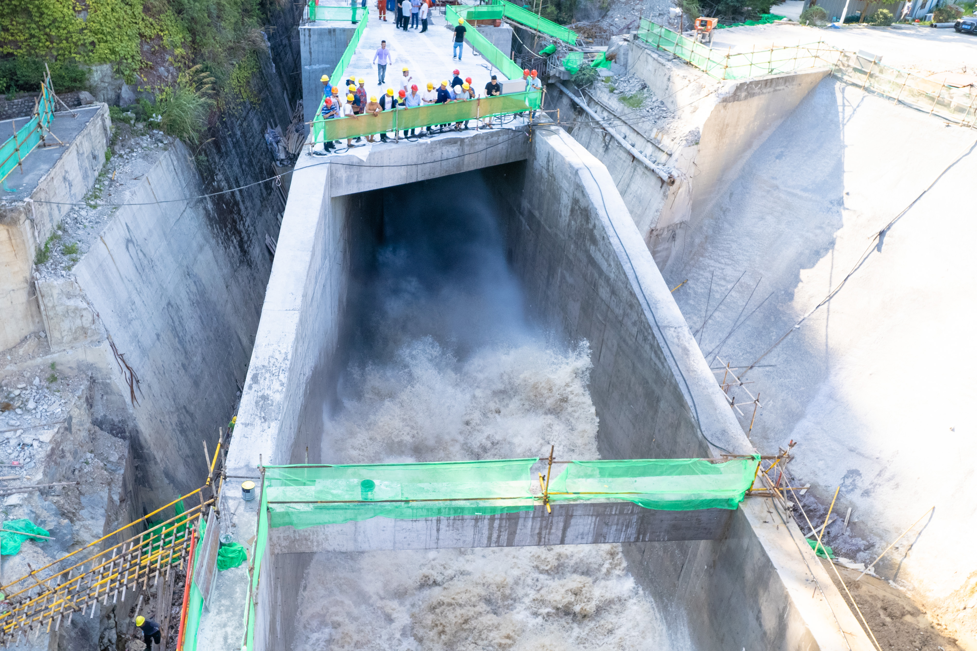 在試通水現場,隨著一聲令下,操作人員嚴格按照操作規程操作,弧門緩緩開啟并不斷加大流量,最終順利完成通水試驗。